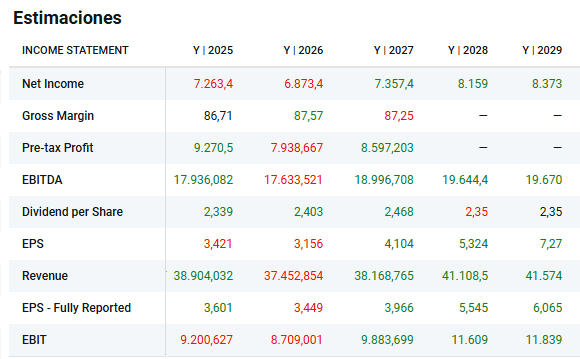 En cuanto al beneficio neto, dado el carácter cíclico del sector energético, este ha mostrado históricamente altibajos. En línea con los ingresos, las estimaciones indican que en los próximos años se mantendrá estable, con una base sólida aunque sin expansiones significativas.