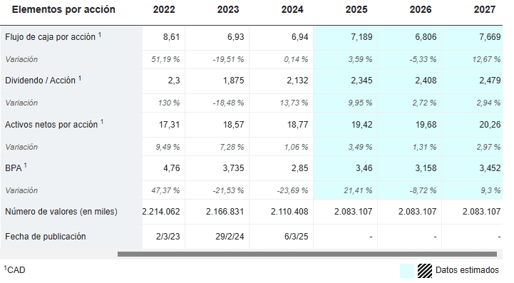 Considero el BPA como el indicador más relevante, ya que refleja de manera directa la rentabilidad atribuible a cada acción y permite evaluar la capacidad de la empresa para generar valor sostenido para sus accionistas. Tras varios ejercicios de descenso, en 2025 el BPA registró un crecimiento del 21,4 %, situándose en 3,46 CAD, equivalentes a aproximadamente 2,5 USD. Para los próximos años, el consenso de mercado indica que el BPA se mantendrá estable, reflejando un escenario conservador pero sólido.