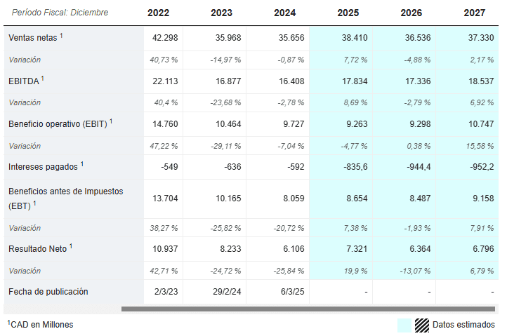 Vamos a ver cuáles son las estimaciones de ventas para los próximos años según la fuente MarketScreener. Los datos aparecen en dólares canadienses, así que los convertiremos a dólares estadounidenses para mantener todo en la misma moneda (yo tengo la acción comprada en el NYSE, en USD).