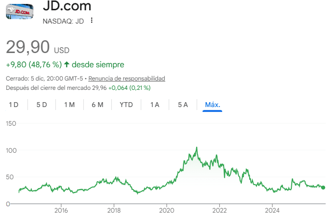 Comenzaré con un repaso rápido del historial bursátil, y para ello, buscaré el precio del ADR de JD (JD ADR stock price) y analizaré el gráfico completo de su evolución. En este análisis me centraré en el ADR porque prefiero invertir en el mercado estadounidense por motivos de liquidez, regulación y facilidad operativa. No obstante, para efectos prácticos el análisis del ADR es equivalente al de la compañía “en origen”, ya que la información económica y los fundamentales subyacentes son los mismos, sólo cambia el vehículo de negociación.