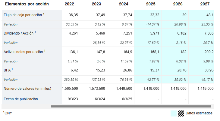 Dado que hoy en día recurrimos a la IA para múltiples análisis, también consulto a Gemini y ChatGPT para obtener una referencia adicional del BPA esperado para 2025, 2026, 2027 y 2028. Normalmente evalúo tanto escenarios conservadores como optimistas, pero para este análisis he decidido centrarme en las previsiones intermedias, es decir, un escenario “normal”. Según ambas IAs, el BPA crecería entre un 20 % y un 25 % anual en los próximos años, alcanzando aproximadamente 4,5 $ (15,07 CNY) en 2028.