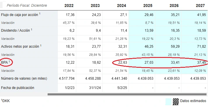 Según los datos disponibles en el bróker DEGIRO, los analistas estiman que el beneficio por acción (BPA) de Novo Nordisk crecerá a un ritmo superior al 15% anual en los próximos años. Aunque esta cifra es algo más conservadora que las previsiones ofrecidas por MarketScreener, ambas coinciden en señalar un crecimiento sólido y sostenido. Tomando como referencia ambas fuentes, podemos establecer una media aproximada del 16,5% de crecimiento anual del BPA, una cifra notable para una empresa de su tamaño y madurez.