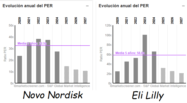 Histórico de PER de Novo Nordisk y de su competidora Eli Lilly según MarketScreener