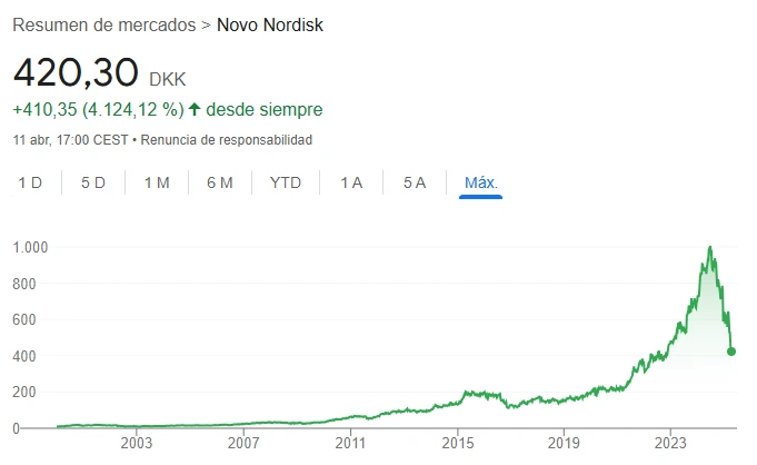 Después de revisar diversos informes y análisis sobre la compañía, mi impresión general es muy positiva. Tanto es así, que he iniciado una posición en Novo Nordisk un par de días antes de escribir esta entrada con una visión de inversión a medio/largo plazo. Por ello, me parece relevante profundizar en su trayectoria reciente, empezando por un repaso al comportamiento de su acción en bolsa. Para ello, realizaré una búsqueda rápida del histórico bajo el término “Novo Nordisk stock price”.