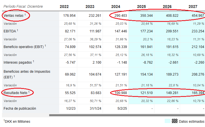 En los últimos años, las ventas de Novo Nordisk han crecido a un ritmo medio del 28% anual, y las proyecciones apuntan a que este impulso continuará en los próximos ejercicios, con un crecimiento estimado superior al 16% anual. Por su parte, el beneficio neto ha experimentado un aumento aún más notable, superando el 30% anual en el pasado reciente, y se espera que siga avanzando a una tasa cercana al 18% anual.