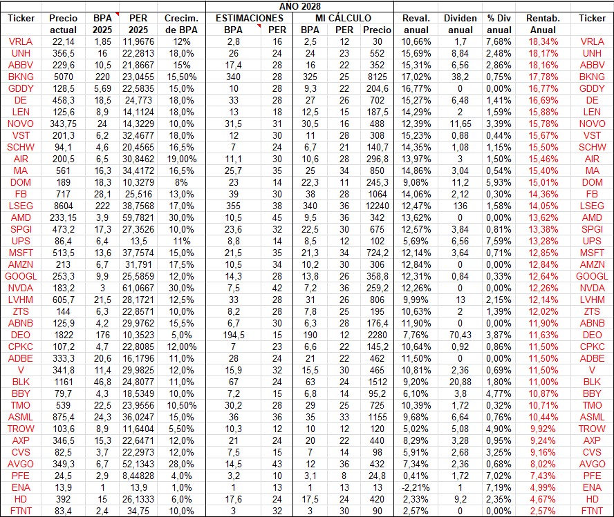 • PER 2028: Múltiplo PER estimado personalmente para el año 2028, teniendo en cuenta el crecimiento y la calidad del negocio.