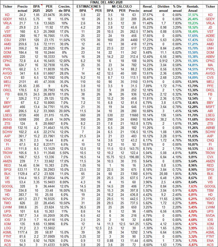 - Precio 2028: Precio objetivo por acción en 2028, calculado multiplicando el BPA estimado por el PER asignado.