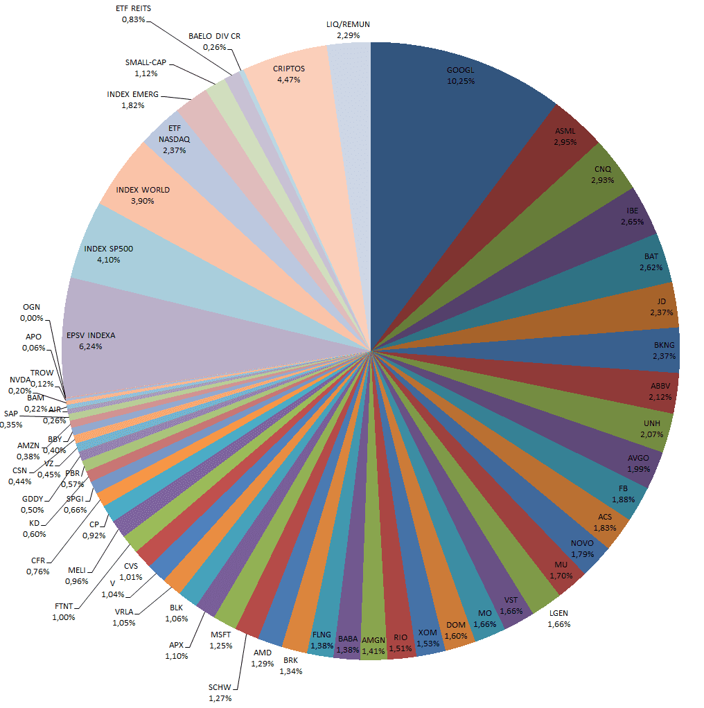 El objetivo es seguir aumentar el peso de los fondos indexados (aunque ya tienen un peso considerable) y no disminuir mucho el de la liquidez. También me gustaría bajar el peso de mis posiciones en ACS y Flex LNG, ya que tengo bastante peso en ellas, aunque solo lo haré si es a precios que considere interesantes y siempre teniendo en cuenta a Hacienda.