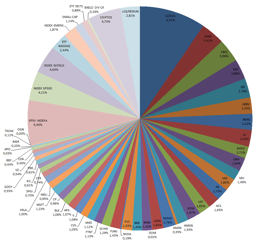 De manera complementaria, seguiré vigilante ante oportunidades puntuales en empresas que considero atractivas y que actualmente tengo en el radar o que me gustaría añadir: Amazon, Nvidia, GoDaddy, Vistra Corporation, Brookfiled Asset Management, Apollo Global Management, Meta Platform, Microsoft, Adobe… Mi enfoque seguirá siendo selectivo y disciplinado, priorizando compañías de calidad, con potencial de crecimiento sostenible y capaces de generar valor a largo plazo.